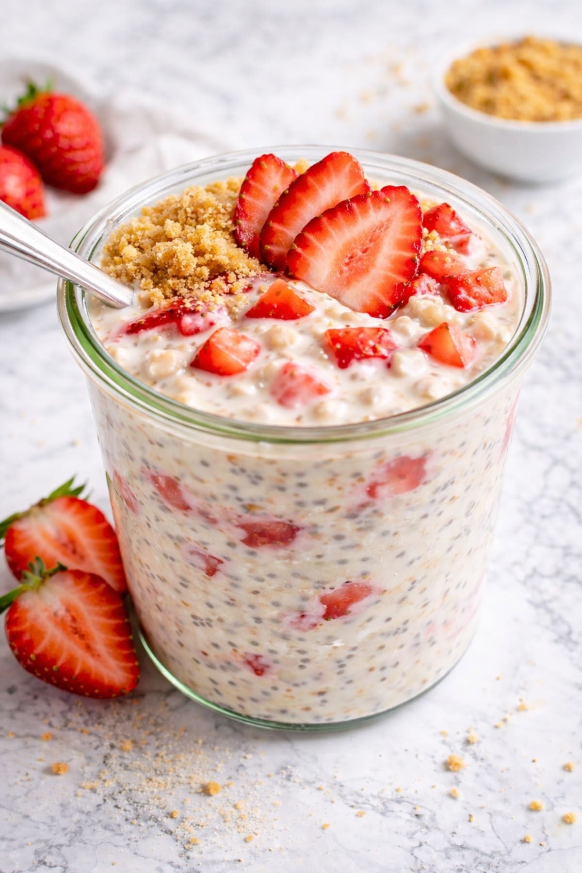 - Top with additional strawberries, graham cracker crumbs, and some strawberry jam before serving, if desired.